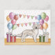 Destei's original cartoon illustration of a cute English cream Golden Retriever breed dog. The dog is placed in a colorful birthday setting with pastel color birthday balloons, gifts and a bunting banner. The pastel colors include pink, green, blue, red, orange and purple. The dog is standing on a yellow wood floor texture and the background has a playful pastel color polka dot pattern.