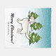 Destei's original cartoon illustration of a cute English cream color Golden Retriever breed dog. The dog is placed in a cold winter scene. In the scene it is snowing in the background and there are three green fir trees behind the dog. The trees have some snow on them. The background is a light blue to white gradient giving this design that freezing cold winter day look. There is also a personalizable text area that now reads "Merry Christmas!" in a beautiful script font. Under it is another personalizable text area for a family name or other custom text.