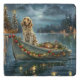 Set sail into the magic of the holiday season with this beautifully detailed illustration, showcasing a proud dog sitting in a festively decorated boat, gliding across a serene Christmas lake. The twinkling lights from nearby pine trees reflect off the water, casting a warm, festive glow that enhances the cozy ambiance. Ornaments dangle from the boat's sides, while glowing lanterns light the way, creating a scene that captures the true essence of Christmas warmth and joy. This nostalgic artwork brings a touch of holiday magic to any space, perfect for those who cherish the spirit of the season.