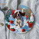 A graceful English Setter runs joyfully through the snowy winter scene, wearing a festive red Christmas hat. This elegant design highlights the breed’s speckled coat, gentle personality, and lively spirit while capturing the warmth and magic of the holiday season. A heartwarming winter moment full of festive charm.