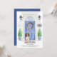Announce your new address with our stylish announcement featuring an English Springer Spaniel, blue front door, welcome mat, slate sign, topiaries and a floral wreath set on a gray brick background.
