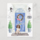Announce your new address with our stylish announcement featuring an English Springer Spaniel, blue front door, welcome mat, slate sign, topiaries and a floral wreath set on a gray brick background.