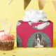 This is a roll of red holiday wrapping paper that features an original photograph of a liver and white English Springer Spaniel sitting with a Santa hat.
