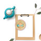 A beautifully illustrated, vintage, copper tea kettle with aquamarine sides with small floral design in middle. Single row of pink and aqua dots below the lid just above the side design, and a surrounding pink pastel frame around the entire design.