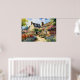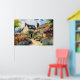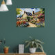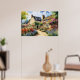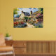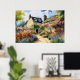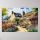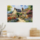 Poster of quaint cottages surrounded by lush, colorful gardens in full bloom, with flowers and greenery winding up the walls. The clear sky and bright sunlight enhance the idyllic and serene atmosphere.