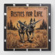 This striking square wall clock features a dimensional illustration of two dogs (possibly cattle dogs/dingos) running toward the viewer through an arid, grassy field. The entire design is rendered in rich brown, black, and burnt orange tones, strongly suggesting a deep carved relief or Engraved Wood Look. The dogs are highly detailed in a stylized, almost graphic manner. They are surrounded by clumps of long, textured dry grass and small rocks in the foreground. The background shows stylized pine trees under a burnt orange sky. The large, three-dimensional embossed text "BESTIES FOR LIFE" is carved across the top. The clock face features a simple clock face border with large, white, numbered tick marks (1 to 12) integrated into the outer frame. The artwork is surrounded by a thick, dark brown decorative border that resembles a black wood frame.