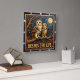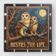 This striking square wall clock features a highly dimensional, nocturnal illustration of two owls perched closely together on a large wooden branch. The entire design is rendered in vibrant orange, blue, and dark brown tones, strongly suggesting a carved relief or Engraved Wood Look. The owls have highly detailed, textured feathers in shades of tan and brown, and are set against a deep blue night sky. The background includes a large, textured golden full moon and numerous stylized stars. The large, three-dimensional embossed text "BESTIES FOR LIFE" is carved across the lower center. The clock face features a simple clock face border with large, white, numbered tick marks (1 to 12) integrated into the frame. The artwork is surrounded by a dark, textured decorative border that resembles a black wood frame.