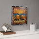 This appealing square wall clock features a highly dimensional illustration of two orange sea turtles side-by-side on a textured beach. The entire design is rendered in rich orange, blue, and tan tones, strongly suggesting a carved relief or Engraved Wood Look. The turtles have highly detailed, textured shells and are positioned on a textured sandy beach. Behind them is a vivid blue ocean and a large sunset with radiating light. The large, three-dimensional embossed text "BESTIES FOR LIFE" is carved across the upper sky area. The clock face features a simple clock face border with large, white, numbered tick marks (1 to 12) integrated into the decorative frame. The artwork is surrounded by a dark, textured decorative border that resembles a black wood frame.