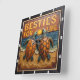 This colorful square wall clock features a highly dimensional illustration of two sea turtles side-by-side. The entire design is rendered in bright orange, blue, and tan tones, strongly suggesting a carved relief or Engraved Wood Look. The turtles have highly detailed, textured shells in orange and green/blue heads, and are positioned on a textured sandy beach. Behind them is a vivid blue ocean and a large sunset with an orange sky. The large, three-dimensional embossed text "BESTIES FOR LIFE" is carved in two lines across the top in orange and yellow. The clock face features a simple clock face border with large, white, numbered tick marks (1 to 12) integrated into the frame. The artwork is surrounded by a dark, textured decorative border that resembles a black wood frame.