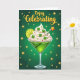 Designed with a festive St. Patrick’s Day feel, this card centers on a martini glass filled with a glowing emerald-green drink 💚. A tall swirl of white whipped cream sits on top like a soft cloud, dotted with tiny green shamrocks and little red-and-gold sprinkles that feel like a shared treat between friends. A fresh lime wheel leans on the rim, as if set there by someone who knows your favorite detail, while a red-and-white candy-striped straw rises from the glass. At the top of the design, the words “Enjoy Celebrating” appear in flowing gold lettering, placed above the drink so your eye lands on the message first. The background is deep forest green with a faint texture, giving the scene a cozy, evening-party mood. Scattered golden stars float around like confetti, adding a little extra sparkle ☘️. A small orange star tops the straw, standing out against the dark green backdrop.