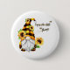 Adorable little gnome in a yellow and black buffalo plaid print has gathered some sunflowers. Text reads "Enjoy the Little Things".