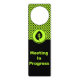 An entrepreneur or a small business finds the door hanger helpful with the message - Meeting In Progress. The door sign is part of a branding package in lime-green and black. Make it yours and load your custom logo and custom text. Customization of font, font size, font color, and color of background and shapes are possible. Should you require assistance or want to discuss a custom design, contact https://t.me/KBMD3signs_chat.
