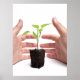 Two hands protect one young plant that grows from a lump of soil