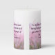 This pillar candle showcases a odibee sans print font with purple letters featuring the "Ephesians 2:8 KJV" bible scripture verse over a picture displaying a field of violet and green colored flowers with an upclose view under a bright sky in the background. This verse is referencing the Book Of Ephesians 2nd chapter showing the 8th verse in this bible scripture quote theme from the King James bible. The candle is covered with a beautiful full-color wrap hand poured, individually designed made with high grade American paraffin & beeswax and, burns approximately 40 hours made in the USA.
