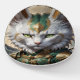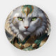 This stunning image features an anthropomorphic cat dressed in ornate green and gold armor. The cat, with white fur and brown markings, has piercing green eyes that add to its mystical presence. A large green gem adorns the center of its chest piece, highlighting the intricate designs of the armor. Set against a backdrop of a large, full moon and a night sky filled with clouds and stars, the scene also includes traditional Asian-style buildings, enhancing the fantastical and immersive atmosphere. This artwork perfectly blends elements of fantasy and cultural aesthetics, making it a captivating piece for art enthusiasts and fantasy lovers alike.