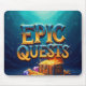 A vibrant watercolor painting featuring the phrase "Epic Quests" in a bold, artistic script. The letters are adorned with shimmering gold accents and surrounded by a treasure chest overflowing with jewels and gold coins. The background is a deep blue, reminiscent of the ocean depths, adding to the sense of adventure and treasure hunting.