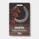 A name tag with a photo featuring a hanging horseshoe adorned with a buffalo plaid ribbon and Christmas decorations.