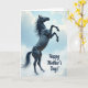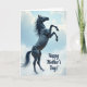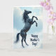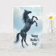 On the front of the card a tall, vertical scene centers on a dark-coated horse rearing up, its front legs lifted as if reaching toward the sky. The animal’s glossy coat reads nearly black, with defined muscles catching faint highlights that make it feel alive and close. Behind it, a calm blue sky opens up with soft white clouds drifting by, giving the moment a gentle, airy contrast to the horse’s strength. The sweeping mane and tail curve in the same direction, like a quiet breeze is brushing past, adding a tender softness ❤️. A small 🌼 touch of warmth comes through in the way the pose feels proud yet affectionate, like a protective presence. In the lower right area, the message “Happy Mother’s Day!” appears in flowing letterforms, set neatly away from the main figure. The text is deep blue, sitting against the pale sky and cloud edge near the bottom corner.