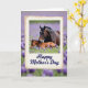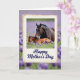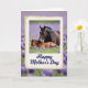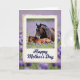 This card features a tender scene of a dark-coated adult horse standing protectively over a resting young foal in a green meadow filled with small purple flowers ❤️. The adult lowers its head toward the foal as if checking in, and the foal lies curled comfortably, creating a gentle, caring moment. A cream-toned, aged-looking border frames the central picture like an old photograph, adding soft texture around the animals. The adult’s mane appears nearly black against a rich brown coat, while the foal’s coat leans warmer and lighter, echoing the closeness between them. Both animals have small white markings on their foreheads that subtly link them as family. Beneath the framed image, the words “Happy Mother’s Day” sit centered in deep blue lettering, standing out against the lighter background 🌼. Behind the frame, the meadow continues as a blurred wash of lavender and green, with worn edges around the border and clusters of purple blooms scattered throughout.