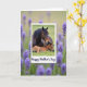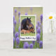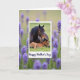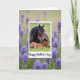This card shows a dark-coated adult horse with a flowing mane standing close to a caramel-colored foal resting in tall green grass, their faces angled toward each other with a tender, protective closeness ❤️. The scene sits inside a bright white photo-style border, like a treasured snapshot set apart from the background. The adult lowers its head slightly, as if nuzzling or watching over the little one, and the foal’s soft eyes add a gentle, affectionate mood. Tiny white wildflowers are scattered through the meadow like small dots of light, giving the ground a springtime feel 🌼. Soft, diffused lighting makes their coats look glossy and smooth without harsh shadows. Behind the framed image, the background fades into a blur of lavender-toned blossoms, creating depth and a calm, dreamy setting. A short message is placed beneath the framed picture in dark, flowing lettering, centered and easy to spot. The purple blooms in the distance appear as rounded, out-of-focus clusters around the white border.