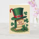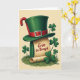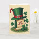 This St. Patrick's Day card features an emerald-green top hat that feels like it’s leaning in close, as if sharing a friendly secret, with a ruby-red band and a shiny silver buckle catching the light 💚. Behind the hat, a creamy scroll unfurls like a note being revealed, giving the scene a gentle, affectionate mood. The words “Erin Go Bragh” sit centered on the scroll in bright red lettering, standing out clearly against the pale paper. Below, a neat patch of green grass supports the hat and scroll, while several shamrocks curl and overlap around them like a small embrace ☘️. Soft lighting adds depth to the hat’s rounded shape, the scroll’s folds, and the clover leaves, keeping everything easy on the eyes. A small hooked red accent peeks from the hat’s upper left, adding a dash of character without stealing attention. The background stays a warm, muted cream so the greens and reds feel richer and more noticeable. The silver buckle is drawn with a tiny highlight along its edge, and the shamrocks show gentle shading where their leaves meet.