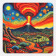 A vivid and colorful depiction of a volcanic eruption dominates the scene with a swirling starlit sky and stylized lava flows. In the foreground, a sinuous river meanders through a landscape dotted with rounded trees and rolling hills, while a dynamic sky swirls above in bold patterns