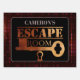 This custom party decoration sign features a mystery escape room theme. The background is a red colored computer binary code pattern on black. A large copper key is printed across the center with a keyhole lock below it. A sample name is printed at the top which you can personalize to include your own custom name or text.