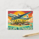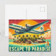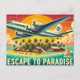 Here’s an enhanced vintage travel postcard featuring a sleek airplane flying over a tropical island with golden beaches, palm trees, and turquoise waters, now with more island details. ✈️🏝️🌅 The scene includes a luxury resort with cabanas, sailboats near the beach, and colorful coral reefs visible through the clear water. The bold 1950s-style typography reads "Escape to Paradise.