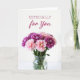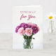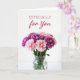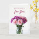 This card features a lush bouquet as the main focus, set against a soft white background that feels calm and intimate ❤️. The blossoms are layered and ruffled, mixing gentle pinks with deeper magenta tones, like flowers gathered for someone you care about. A clear glass vase holds the arrangement, and you can see green stems and a bit of water inside, adding a quiet, real-life touch. Near the top, the words “ESPECIALLY for You” appear in a deep rose color, with “ESPECIALLY” in neat uppercase and “for You” in a flowing cursive style. The lettering sits above the flowers so your eyes read the message first, then drift down into the bouquet. Soft, diffused lighting smooths the scene and highlights the petal textures, giving the arrangement a tender, just-gifted look 🌼. The background stays bright and uncluttered, letting the pink and magenta blooms stand out clearly in the center.