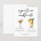 This chic signature cocktails list features simple black typography above 2 drinks and their ingredients for your wedding bar. An espresso martini and Pina Colada drawing add a cool flair to your bar menu sheet. Complete with the couple's names and date for their reception.