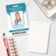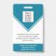 This personalized turquoise ID badge includes an employee photo, name, title, hospital/company name, location, employee ID number, and barcode. Background features turquoise and white. Back of badge features your logo and additional custom text fields for return information or other details. Perfect for medical or corporate facilities who need security identification.