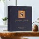 Luxury modern elegant monogram initial and family name signature script style personalized estate planning trust documents portfolio binder featuring a faux metallic gold copper square with initial letter and your custom text over a dark purple indigo leather like (PRINTED TEXTURE) background..