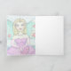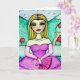 Congratulations Card beautiful illustration done in mixed media of a beautiful blond girl and female, sitting in the middle of a natural fantasy landscape. Dress elegant violet dress, wearing gloves of the same color and a fan in hand.
