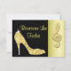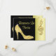 Women's personalized, elegant custom double sided 25th Birthday Party Save The Date cards for birthday parties with glitz and glamor. Woman's beautiful gold and black save the date card with a stunning glamorous printed image rhinestones, glitter, sequins, diamonds bling jewels sparkle high heels stilettos fashion shoe, and glittery gold treble clef on a black and gold background. Chic, classy, cute, girly, modern save the date cards for birthday's in trendy, fashionable colors / colors. These groovy, fancy, stylish, sophisticated, pretty, girlie cards are decorated / printed on both sides. PLEASE NOTE: All products on Zazzle have flat printed images.