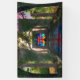 An old stone church stands in ruins amid the grass and flowers of a sunny hilltop, but the stained glass window still colors the morning light with the design of a red cross against a bright sunrise. The old stone arches are broken, but the boughs of blossoming trees frame the window.