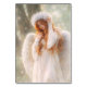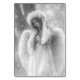 A serene angel stands gracefully in a misty forest, surrounded by soft, glowing lights. Her long auburn hair cascades over exquisite white wings.
