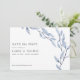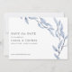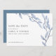 Modern botanical wedding save the date in sheer dusty blue pastel watercolor features blue foliage on the left side framing your names and wedding details.