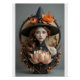 A stunning ceramic artwork presented as a high-relief tile or upper-body sculpture, crafted with exceptional detail and artistry. The central figure is a graceful young maiden with delicately sculpted features, finished in smooth matte and satin glazes for a lifelike presence. Her flowing brown hair is richly textured and carefully glazed, while she wears a tall, pointed hat adorned with a large ceramic orange flower and autumnal leaves. Ornate jewelry—including layered necklaces and teardrop earrings—sparkles with turquoise-like and antique gold glazes. In front of her rests a finely sculpted ceramic lotus flower in bloom, rendered in soft pastel or mystical glazes. A circular moon motif frames the composition, surrounded by swirling autumn leaves and branches, all hand-painted in warm, earthy tones. The piece blends elegance and seasonal beauty, showcasing masterful sculpting, intricate glazing, and a sophisticated play of textures under professional studio lighting.