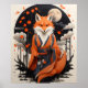 A captivating illustration showcasing a fox adorned in a traditional robe, surrounded by an enigmatic atmosphere of a moonlit night, accentuated with dark silhouettes and vibrant autumn leaves.