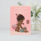 Elegant custom personalized vintage ethnic girl baby shower Save the Date card template for African American baby girls with a beautiful vintage illustration of a cute and adorable baby girl with stylish pink diaper and a pink bow in her hair with trailing ribbons. She is ringing you on an old red retro telephone to ask you to save the date! She is holding a little suitcase and her funny, quirky teddy bear is leaning against it - she's all packed up and ready for her arrival!! The background is a pretty pink with a classy pink chevrons border. Chic, trendy, glamorous, girly, fun, fashionable, whimsical, humorous, amusing, affordable personalized / personalised custom baby shower save the dates templates for ethnic baby girls. Decorated on both sides. The back / reverse side has the same design. Double sided printing / front and back. If you need any assistance customizing your product please contact me through my store and I will be happy to help.