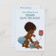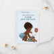 Elegant custom personalized ethnic boy baby shower Save the Date card template for baby boys with a beautiful vintage illustration of a cute and adorable African American baby boy with stylish blue diaper. He is ringing you on an old red retro telephone to ask you to save the date! He is holding a little suitcase and his funny, quirky teddy bear is leaning against it - he's all packed up and ready for his arrival!! The background is a modern blue and white diagonal stripes. Chic, trendy, fun, fashionable, whimsical, humorous, amusing, affordable personalized / personalised custom baby shower save the dates templates for baby boys. Decorated on both sides. The back / reverse side has the same design. Double sided printing / front and back. If you need any assistance customizing your product please contact me through my store and I will be happy to help.