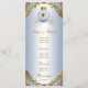 Prince baby shower menu with cute African American baby prince and carriage on an elegant baby blue and gold swirl background. These elegant prince baby shower menus are easily customized for your event by simply adding your details in the font style any layout you prefer.