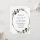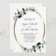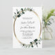 Eucalyptus All in One QR Code RSVP Gold Metallic Wedding Invitation... Our "All in One" luxe botanical wedding invitation features a gold metallic oval frame embellished with emerald-hued eucalyptus leaves bordering your personalized wedding invitation text. The back of the invitation also displays your wedding website QR code as well as the website's URL itself allowing your invitees to easily RSVP online and view all of the details normally sent in a wedding packet. This modern style wedding invitation was designed to be both elegant and budget conscious... not to mention time-saving. All example text can be easily revised with your own information on the personalization template.