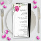 This wedding menu card designed for a budget-friendly celebration features a beautiful eucalyptus branch adorned with delicate pink roses white flowers and soft sage green leaves. Surrounding the card is a thin black border that adds a touch of elegance. The word 'MENU' along with the couple's names is presented in a stylish decorative font, making it stand out. On the reverse side, the card is a solid black, providing a striking contrast to the front design.