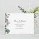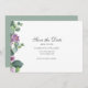 Modern Eucalyptus Botanical Script Save the Date card. Featuring purple and green bloom with script typography.