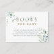 This book request baby shower card features painted watercolor eucalyptus and green leaves with botanical gold letters.