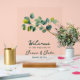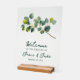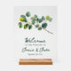This elegant transparent acrylic wedding welcome sign features delicate illustrations of eucalyptus branches in vibrant shades of green, creating a fresh and natural feel. The minimalist, yet stylish design highlights the "Welcome" message in sophisticated hand written stye lettering, making it an inviting and chic piece for any wedding, party or celebration venue. Perfect for both indoor and outdoor settings, this acrylic sign combines modern aesthetics with nature-inspired charm, seamlessly blending into various wedding themes like rustic, botanical, or contemporary. The transparency adds a subtle, airy touch that enhances any entrance or ceremony space.
