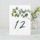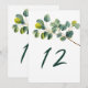 Eucalyptus branch wedding table number. Add a touch of serene elegance to your wedding reception with this beautifully designed table number card, featuring a graceful watercolor style illustration of a eucalyptus branch and lush green leaves. The botanical artwork evokes the fresh charm of a tranquil garden, with pretty, overlapping foliage capturing the natural beauty of greenery in soft, inviting tones.