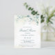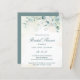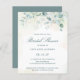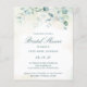 Elegant budget bridal shower invitation featuring eucalyptus leaves and greenery with speckles of faux gold glitter at the top. Below are your event details in dark green, over a pastel watercolor wash. The backside is a matching shade of soft blue green. A simple, rustic design that is great for a botanical themed celebration in the summer. These cheap bridal shower invitations are printed on sheets of paper for a budget friendly option.