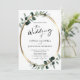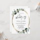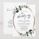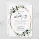 Eucalyptus Chic Modern Calligraphy QR Code RSVP Wedding Invitation... Our "all in one" botanical wedding invitation features a faux gold oval frame embellished with emerald-hued eucalyptus leaves on a crisp white background. Chic modern calligraphy displays the text for "the Wedding of", "and" as well as "reception to follow" accompanied by elegant serif typography for the text you can personalize. The back of the invitation also displays your wedding website QR code as well as the website's URL itself allowing your invitees to easily RSVP online and view all of the details typically sent in a wedding packet. This modern style wedding invitation was designed to be both elegant and budget conscious... not to mention time-saving. The example QR code graphic and all example text (aside from the graphic calligraphy elements) can be easily revised with your own information on the personalization template.